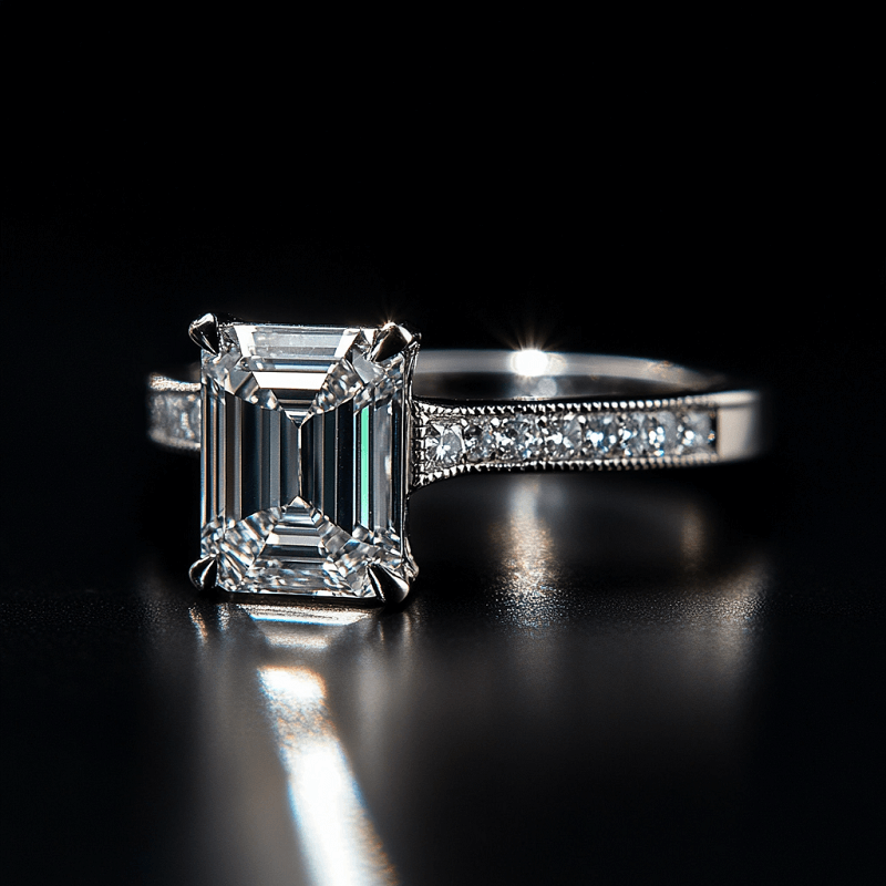 It is characterized by its rectangular shape with cut corners and step-like facets. The parallel facets reflect light in a refined, linear pattern, accentuating the stone's colour and clarity. The emerald cut's elegant, 'framed' appearance highlights the stone's beauty with a sophisticated border that draws attention to its central brilliance. Known for its sophisticated style, it showcases a diamond's internal characteristics, making it a popular choice for those who appreciate understated glamour and classic elegance.